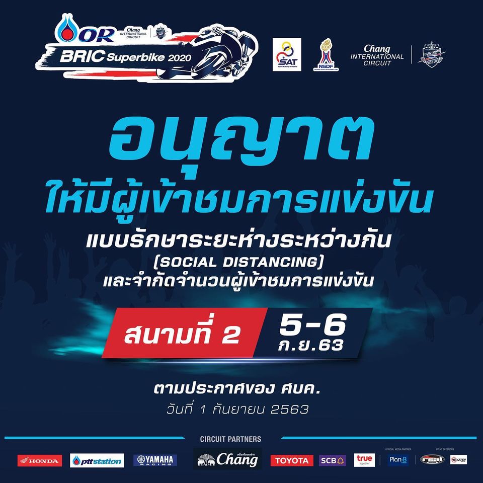 “ถือได้ว่า เป็นข่าวดีของแฟนความเร็วชาวไทยจริงๆ เมื่อ ศึก OR BRIC Superbike สนาม 2 ได้รับอนุญาตให้มีแฟนเข้าชมการแข่งขันได้แล้ว แต่ต้องอยู่ภายใต้มาตรการเว้นระยะห่างทางสังคม และจำกัดจำนวนผู้เข้าชมการแข่งขันอยู่ที่ 6,000 คนต่อสนาม โดยยึดตามคำสั่งศูนย์บริหารสถานการณ์การแพร่ระบาดของโรคติดเชื้อไวรัสโคโรนา 2019 (โควิด-19) ที่ 9/2563 เรื่อง แนวปฏิบัติตามข้อกำหนดออกตามความในมาตรา 9 แห่งพระราชกำหนดการบริหารราชการในสถานการณ์ฉุกเฉิน พ.ศ. 2548 (ฉบับที่ 8)”