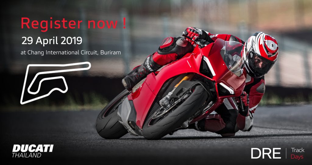 สำหรับกิจกรรม “DRE Track Days 2019” จะจัดขึ้นในวันที่ 29 เม.ย.62 ที่สนามช้าง อินเตอร์เนชั่นแนล เซอร์กิต โดยมีค่าสมัคร 6,500 บาทต่อท่าน ซึ่งจะประกอบไปด้วยการนำรถดูคาติลงขี่ในสนาม (Track Day) ทั้งหมด 7 รอบ รอบละ 15 นาที, การทดสอบ Panigale V4 อีก 1 รอบ ในเวลา 15 นาที, อาหารมื้อกลางวันสำหรับผู้ขับขี่, อาหารว่างและน้ำดื่มสำหรับผู้ขับขี่และผู้ติดตาม รวมถึงพื้นที่สำหรับการเตรียมรถลงสนาม ทั้งนี้ สำหรับผู้ที่สนใจเข้าร่วมกิจกรรมดังกล่าว สามารถติดต่อสอบถามได้ที่ผู้จำหน่ายดูคาติทุกสาขา